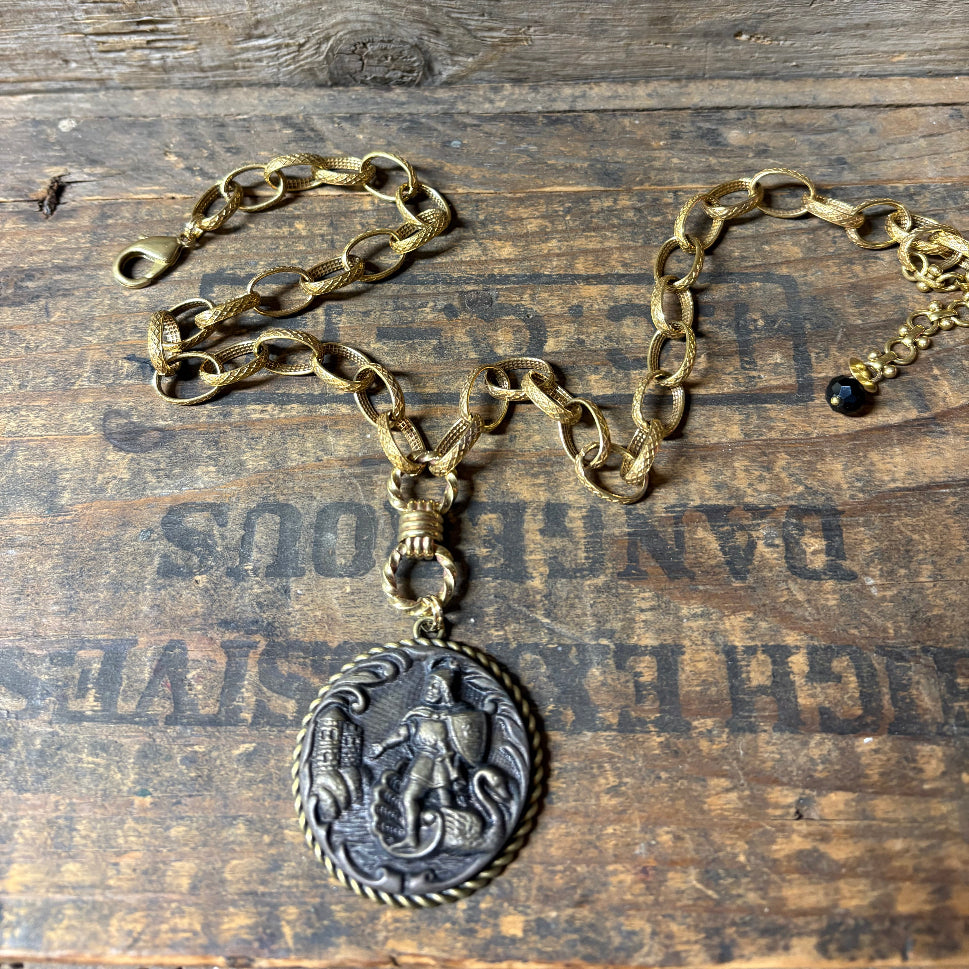 This stunning antique button dating back to 1890 features the image of Saint George slaying the dragon. Saint George symbolized courage, protection and victory over evil.